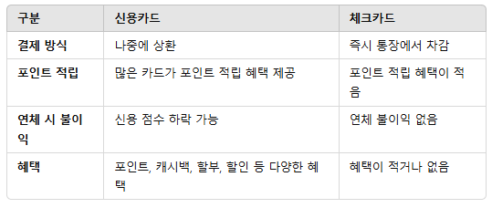 - 과소비 위험: 신용카드는 사용한 금액을 바로 지불하지 않기 때문에 과소비로 이어질 수 있습니다. 계획적인 소비를 유지해야 합니다.